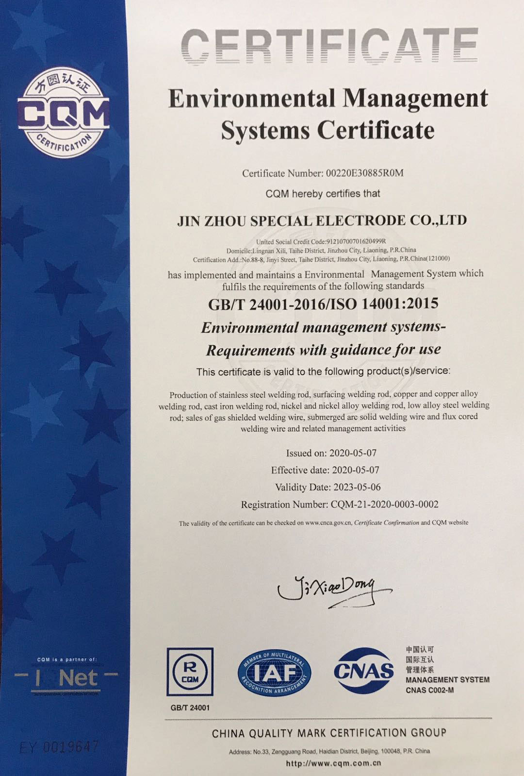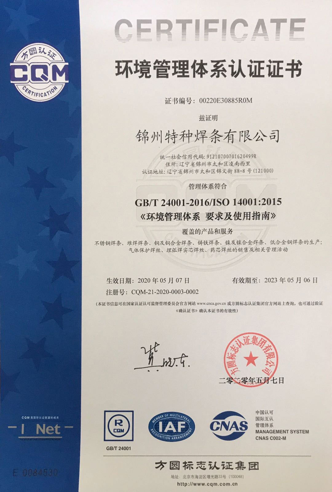 認(rèn)證名稱:環(huán)境管理體系認(rèn)證證書