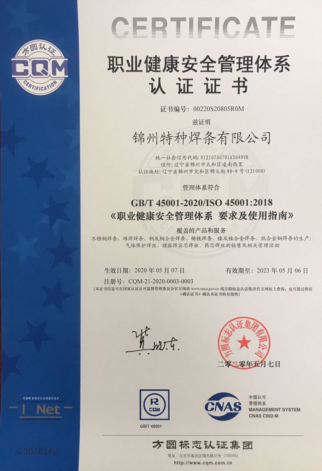認(rèn)證名稱:職業(yè)健康安全管理體系認(rèn)證證書